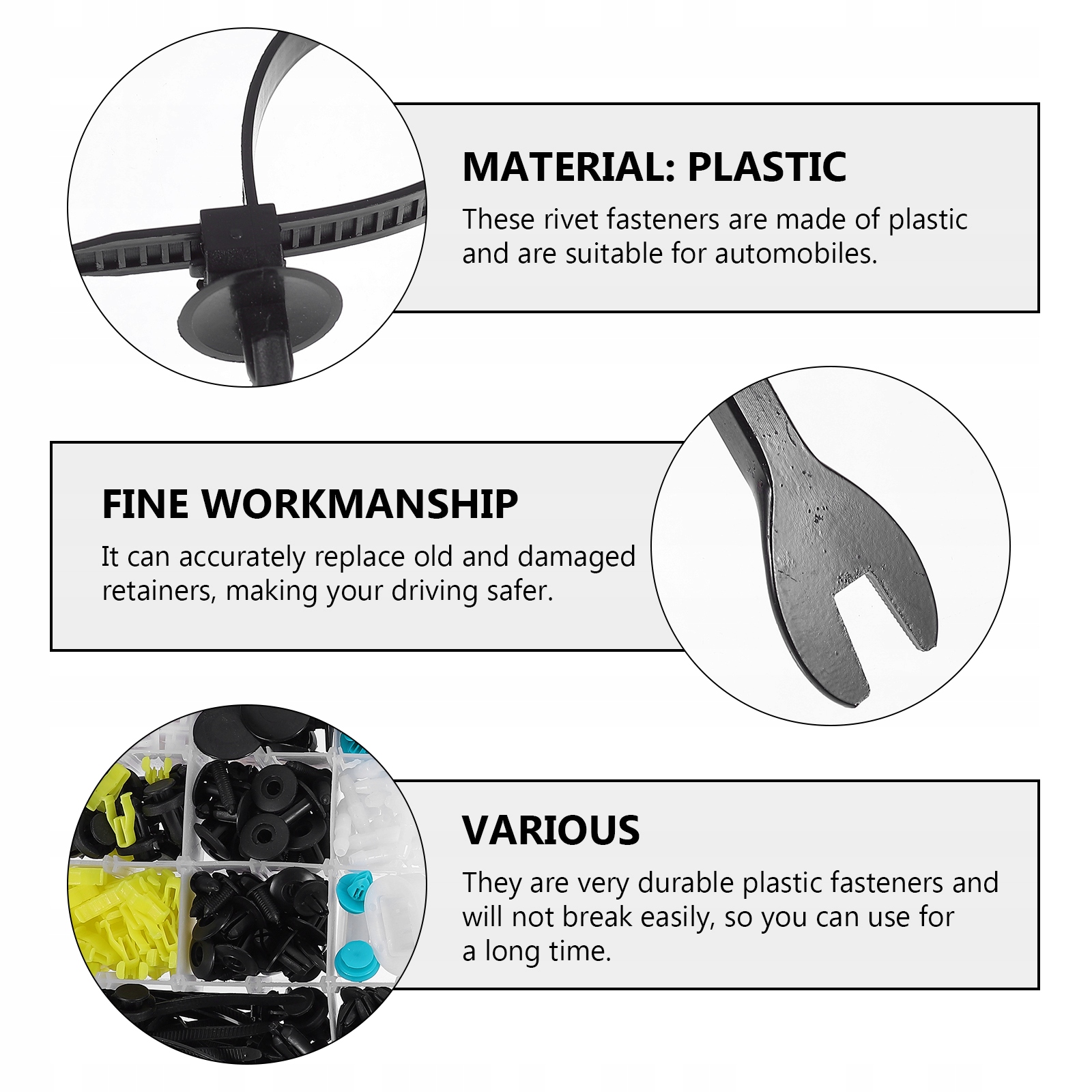 это набор профессиональных зажимов для автомобиля, изготовленных из высококачественных материалов, безопасных и экологически чистых, простых в эксплуатации и установке, и очень практичных. Он может легко заменить старые файлы автомобиля разъем. Тщательно обработанный зажим имеет хорошую стабильность и долговечность и может служить вам в течение длительного времени без легкого повреждения.