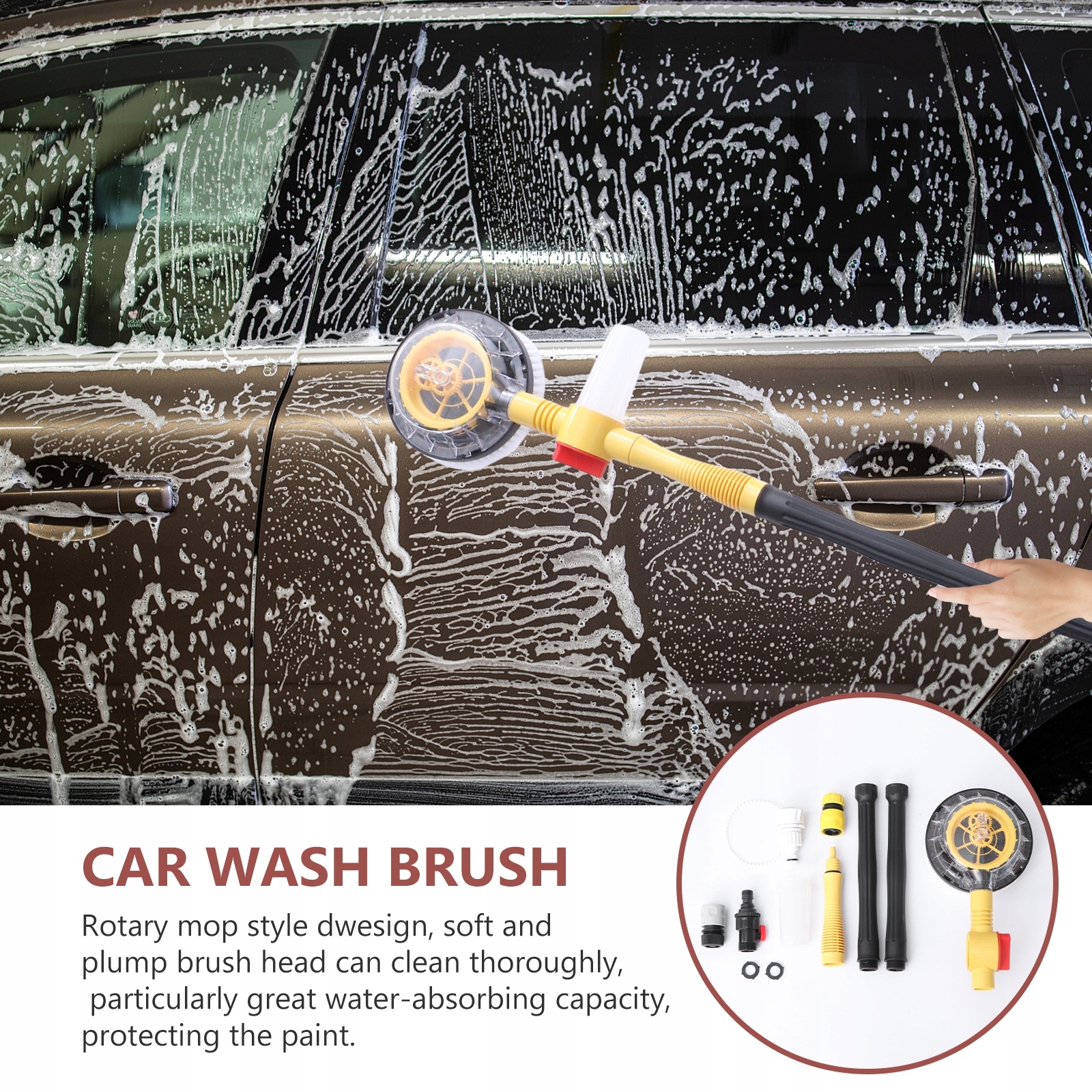 этот автоматический вращающийся выход воды не нуждается в электричестве. Это экономит время и энергию. Вода поступает в трубу, высокое давление привода заставляет воду толкать шестерню и заставляет ее работать автоматически. Вращающаяся швабра в стиле dwesign и пухлая головка щетки могут тщательно очищать, особенно сильно поглощая воду, защищая краску.п>
