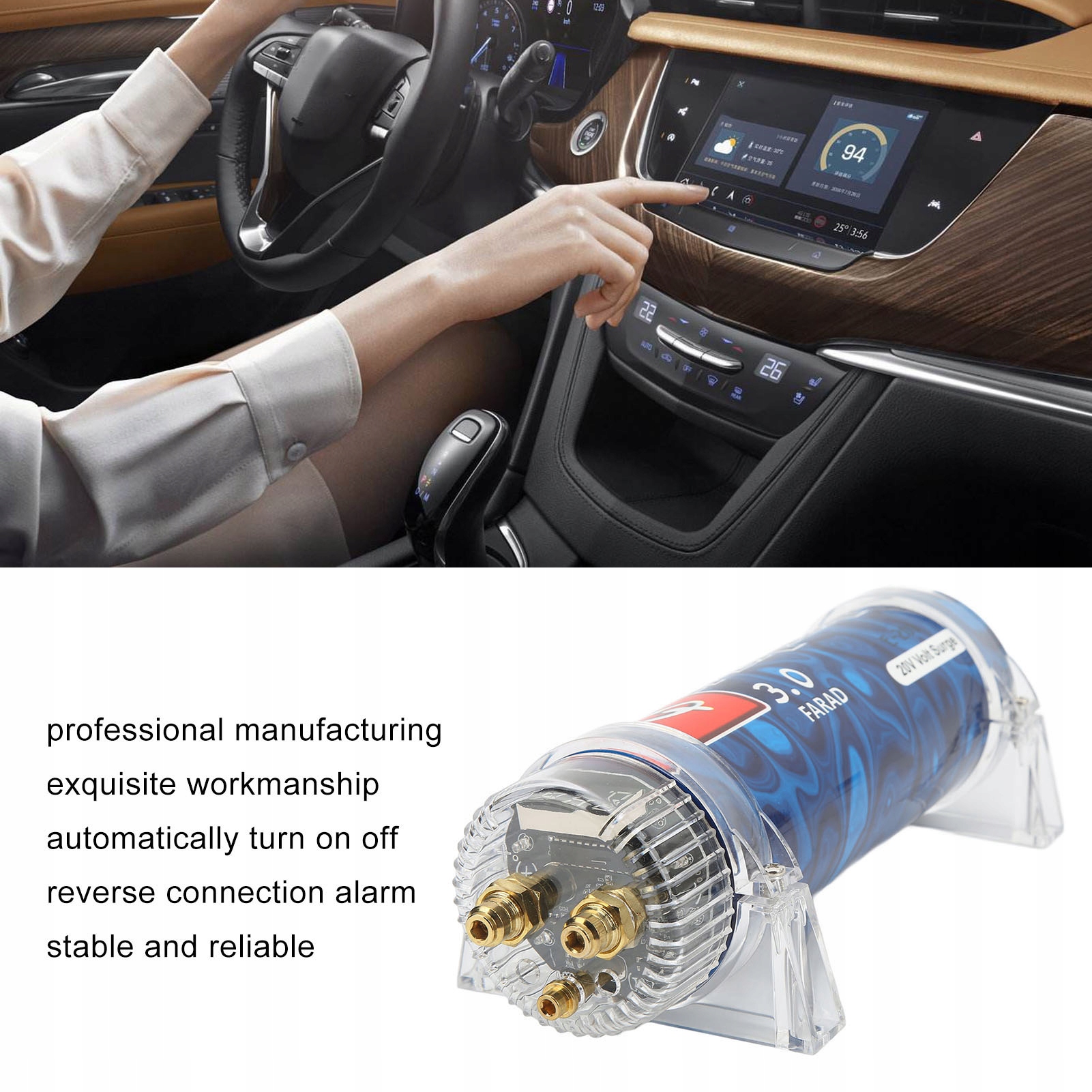 2. Функция: 3 Фарад цифровой автомобильный конденсатор обеспечит мгновенную мощность по требованию для питания энергоемких усилителей и стабилизации этого напряжения.