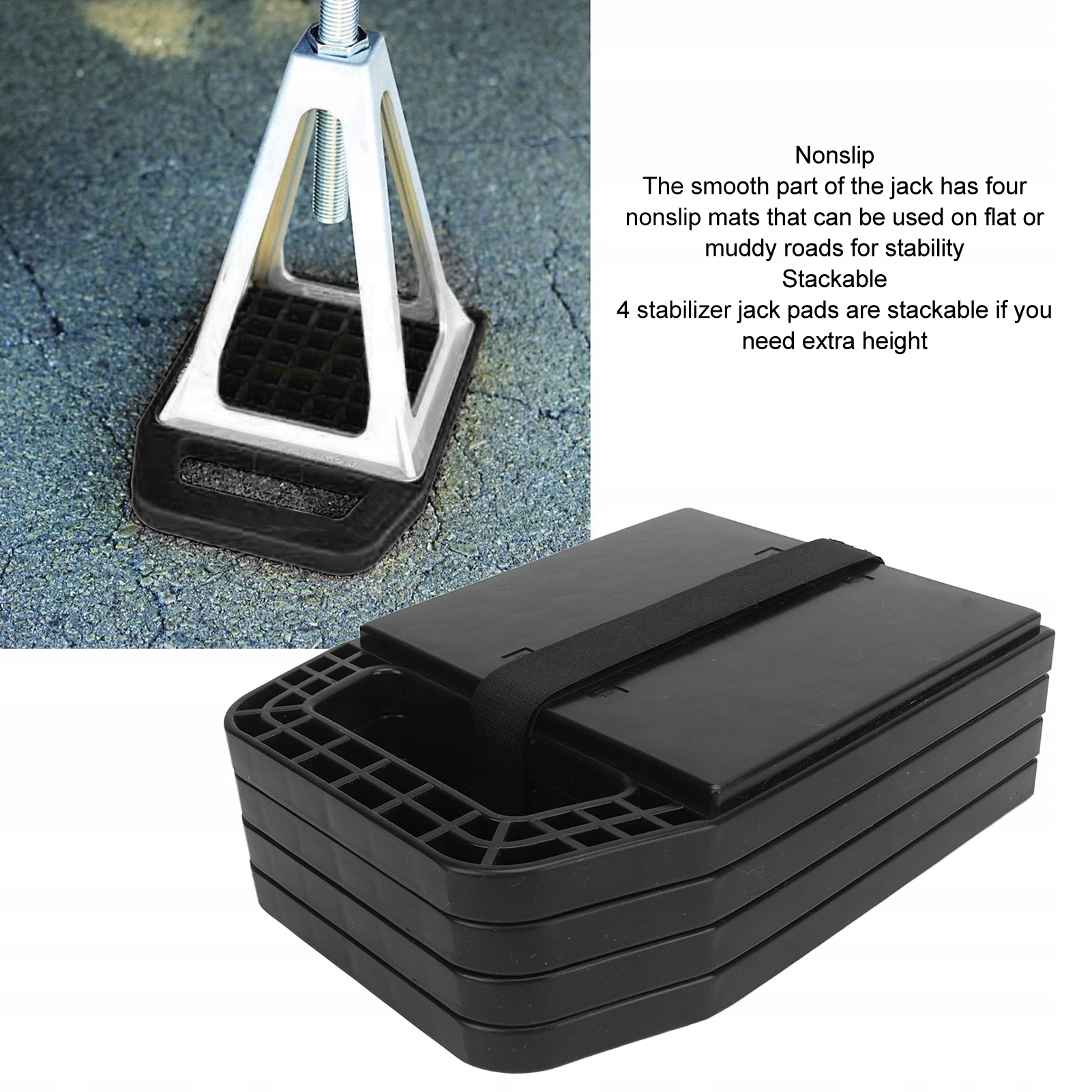 2. Противоскользящие: гладкая часть домкрата оснащена четырьмя противоскользящими ковриками, которые можно использовать на ровных или грязных дорогах для обеспечения устойчивости. Для достижения лучших результатов его можно использовать с алюминиевой или пластиковой стабилизирующей подставкой.