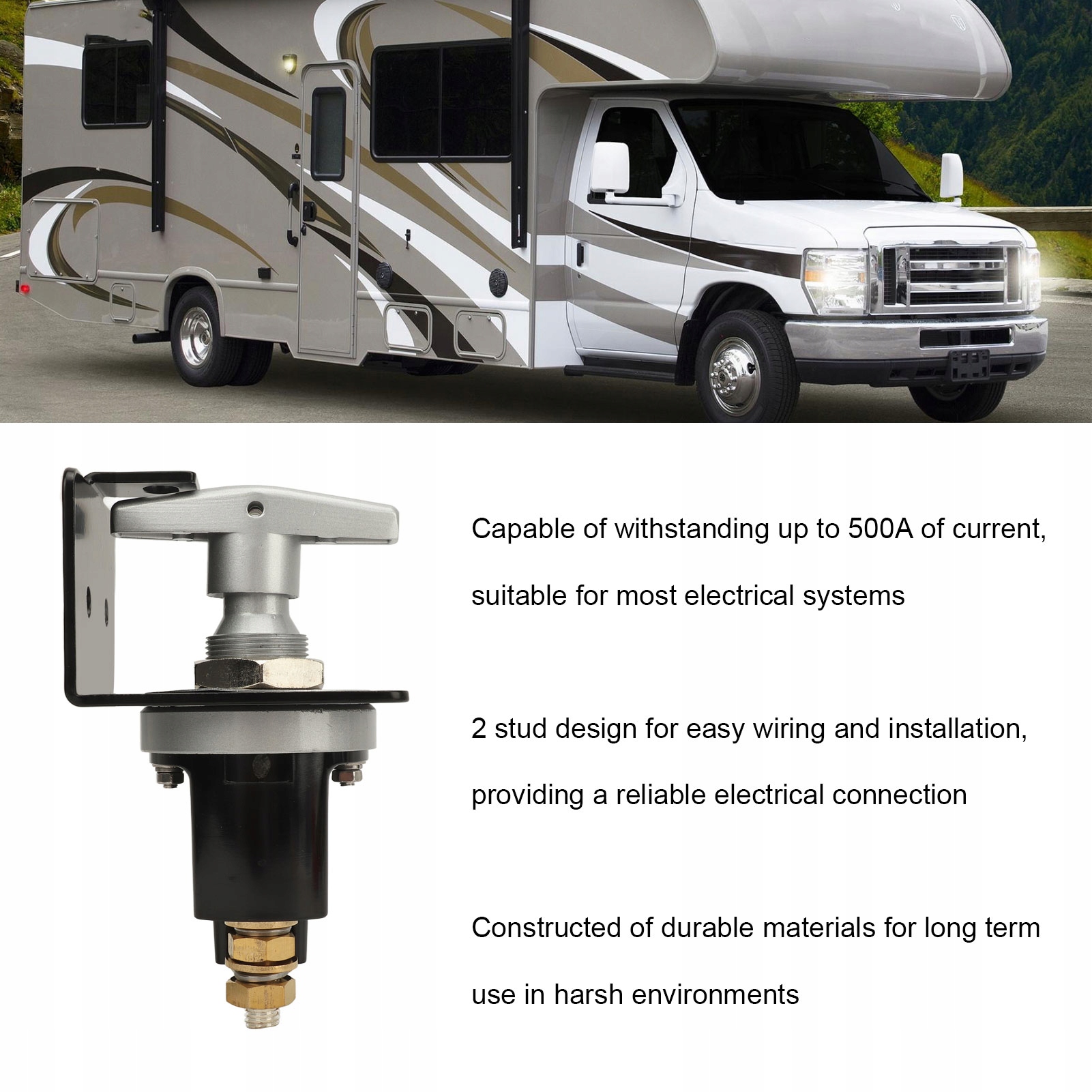 3. Конструкция с 2 болтами. Выключатель аккумулятора имеет конструкцию с 2 болтами, что упрощает проводку и установку, обеспечивая надежное электрическое соединение.