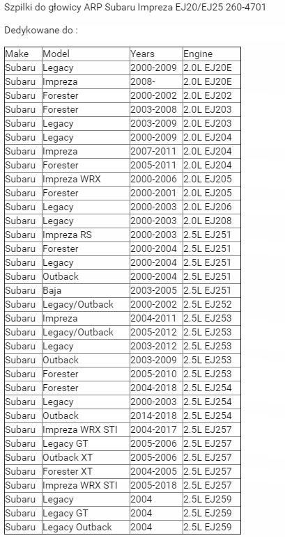 штыри головки ARP®изготовлены из материала Custom Age 625 Plus® предназначен для Subaru Impreza, Forester, Legacy EJ20/EJ25 DOHC. В комплект входит набор штифтов, шайб, гаек для одного двигателя и смазка для монтажа.