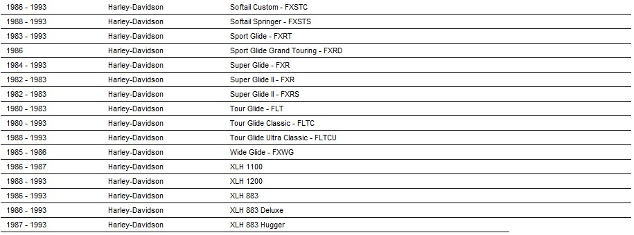 1000 Sportster XLH, 1000 Sportster XLX, 1200 Fat Bob FXEF, 1200 Super Glide FXE, 80 Electra Glide FLH,