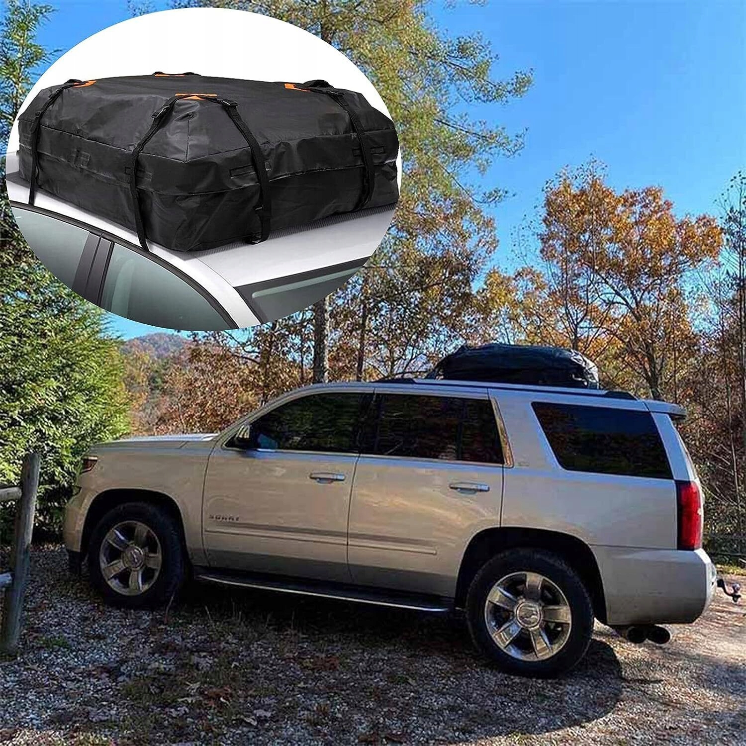 【【лучший эффект уплотнения】 ПВХ 420D + двойное водонепроницаемое и прочное покрытие, высокая устойчивость к разрыву, водонепроницаемая конструкция материала, очень прочная; со специальным внутренним покрытием из ПВХ коробка на крыше автомобиля может защитить интерьер от воды. Молния поставляется с крышкой на молнии, чтобы предотвратить попадание дождевой воды внутрь.