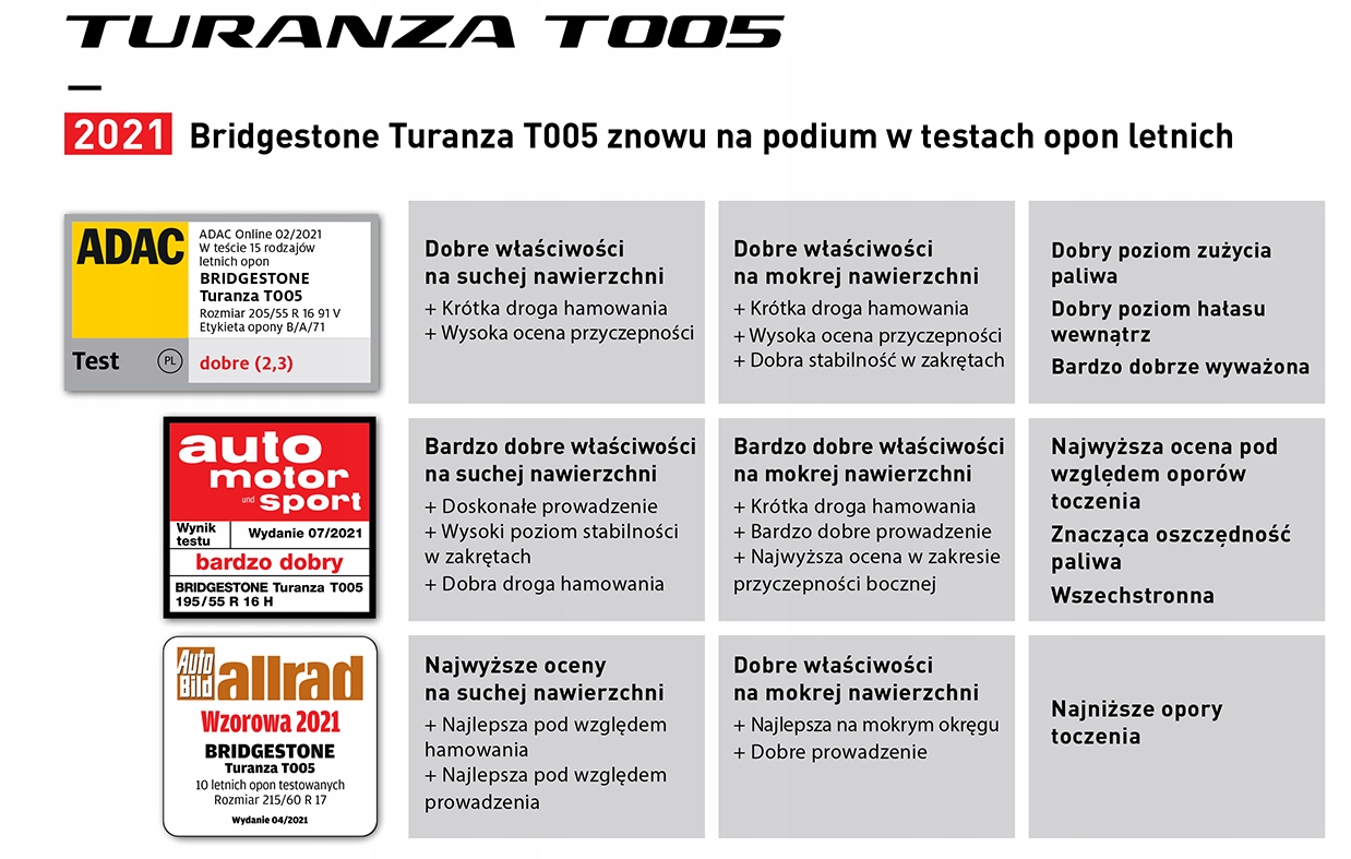 Bridgestone Turanza T005 обеспечивает самый короткий в своем классе тормозной путь и максимальную тягу даже на мокрой дороге. С шиной Bridgestone вам не нужно бояться поворотов на шоссе или неожиданного торможения в городе, и вы можете наслаждаться поездкой независимо от того, куда идет ваш маршрут. Шина Turanza T005 заняла 2 - е место в большинстве ведущих испытаний шин 2020 года. Авторы всех рейтингов – ADAC, Auto World, Auto Moto, Motor и Auto Motor и Sport однозначно отметили четыре преимущества Turanza: очень сбалансированная и высокая производительность во всех категориях, лучшая на сухом покрытии, очень хорошая на мокром покрытии, самое низкое сопротивление качению