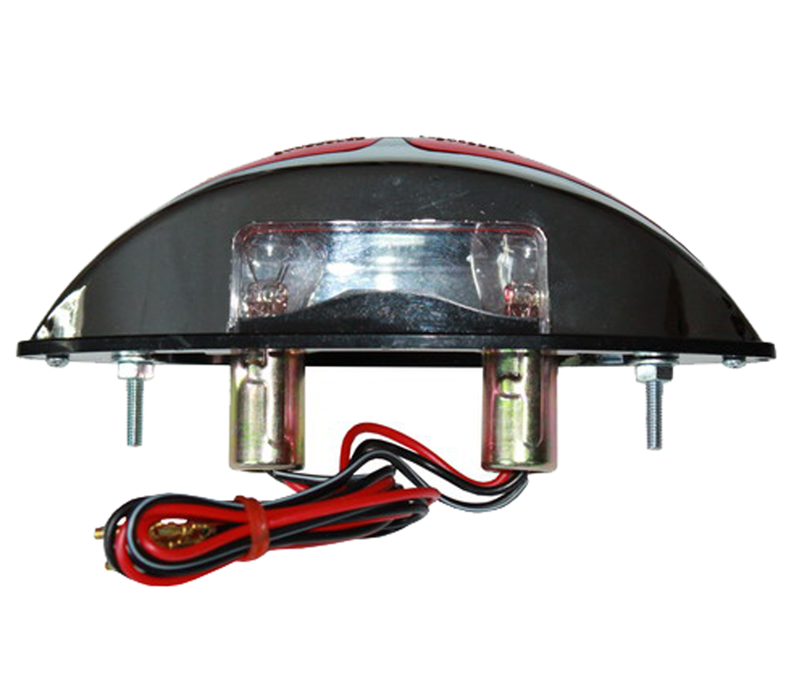 описание: задняя сосулька лампа. Корпус выполнен из пластика, имитирующего хром, абажур красного цвета и имеет знаки одобрения E11. Лампа имеет 2 лампы 12V 21/5W и подсветку номерного знака