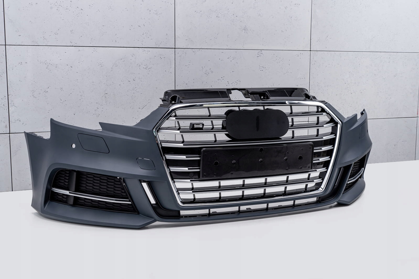 Передняя решетка - Ячеистая решетка является отличительной чертой моделей S и напоминает впечатляющие мощные спортивные автомобили высокого класса. Этот элемент впечатляет своим спортивным характером, а блеск окрашенных в черный цвет элементов добавляет элегантности, благодаря чему он идеально сочетается с впечатляющим дизайном AUDI A3. По обеим сторонам номерного знака предусмотрены места для парктроников PDC.