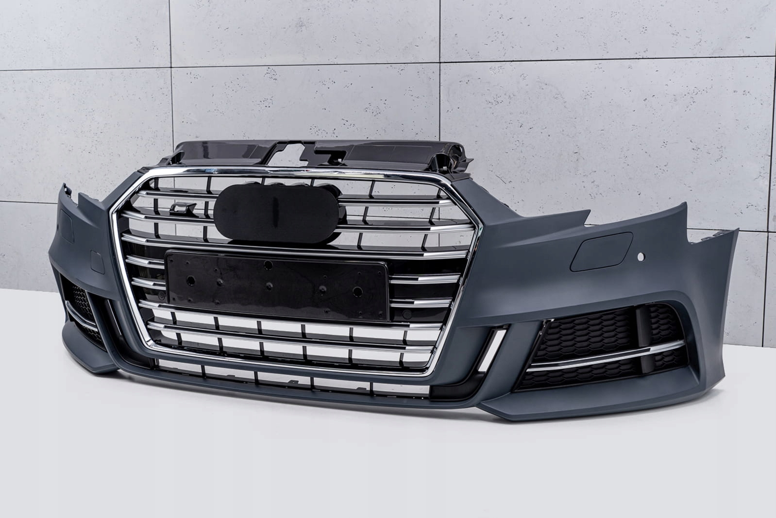 Передняя решетка - Ячеистая решетка является отличительной чертой моделей S и напоминает впечатляющие мощные спортивные автомобили высокого класса. Этот элемент впечатляет своим спортивным характером, а блеск окрашенных в черный цвет элементов добавляет элегантности, благодаря чему он идеально сочетается с впечатляющим дизайном AUDI A3. По обеим сторонам номерного знака предусмотрены места для парктроников PDC.