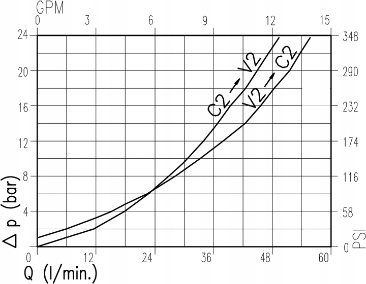 поток от V1 к C1 и от V2 к C2 является полностью заблокирован когда на V1 и V2 не работает давление, в то время как разблокируется, когда на V1 или v2 влияет давление.