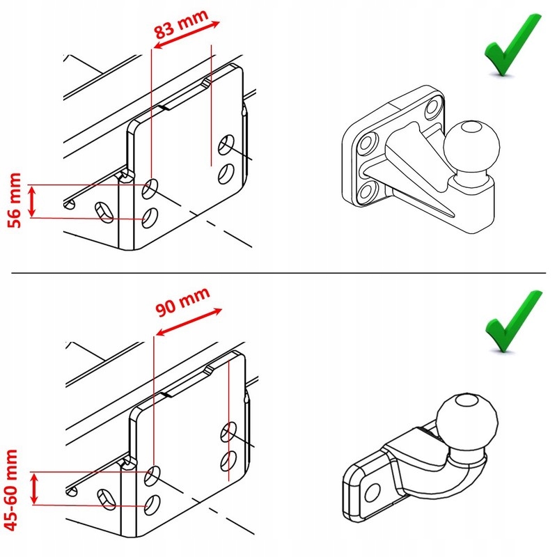 Фланцевый шаровой адаптер фаркопа является универсальным и подходит для всех шаровых шарниров фаркопа, крепящихся спереди с помощью двух винтов с расстоянием между отверстиями 90 мм и четырех винтов с расстоянием между отверстиями 83x56. мм.