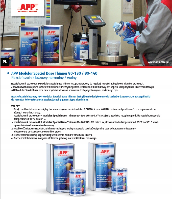 APP Modular Special Base thinner-это разбавитель для регулировки вязкости распыления органических базовых покрытий. Предназначен для использования с базовым слоем App Modular Special Base и другими лаками аналогичного типа. Разбавитель помогает лакировщику при работе с новейшими цветовыми рецептами базовых лаков, а также с металлическими и перламутровыми лаками.