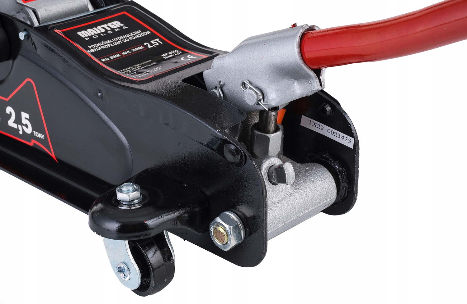 домкрат оснащен стальными колесами передней осии поворотными колесами задней оси, а также встроенным регулирующим клапаном с управлением в рычаге домкрата.