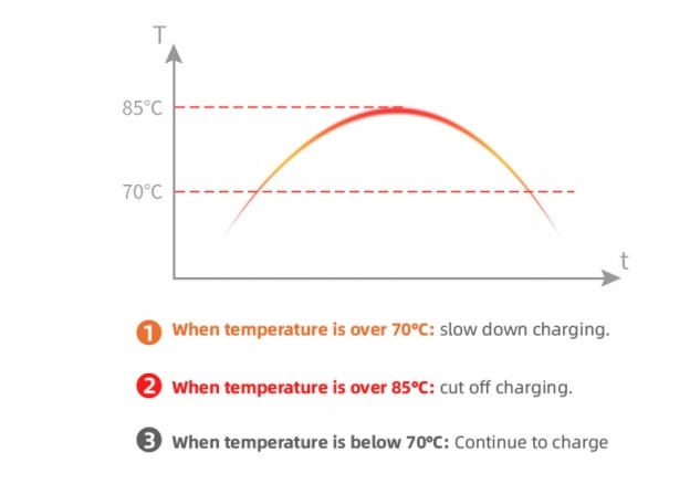 Как только температура упадет до 70°C, зарядка возобновится.