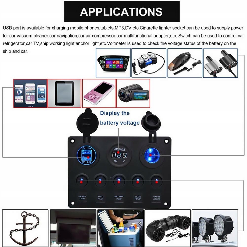 имеет широкий спектр применения и может использоваться в качестве переключателя управления для автомобильных огней, сигнальных огней, противотуманных фар, автомобильных зарядных устройств и других продуктов.