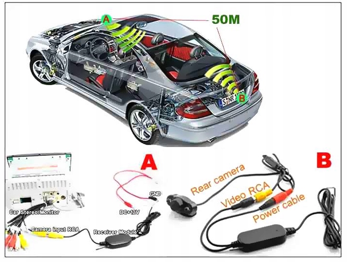 беспроводной модуль для камер заднего вида обеспечивает беспроводную передачу видеосигнала. Работает с камерой заднего вида автомобиля и монитором или другим видеооборудованием, оснащенным дополнительным входом видеосигнала (RCA)