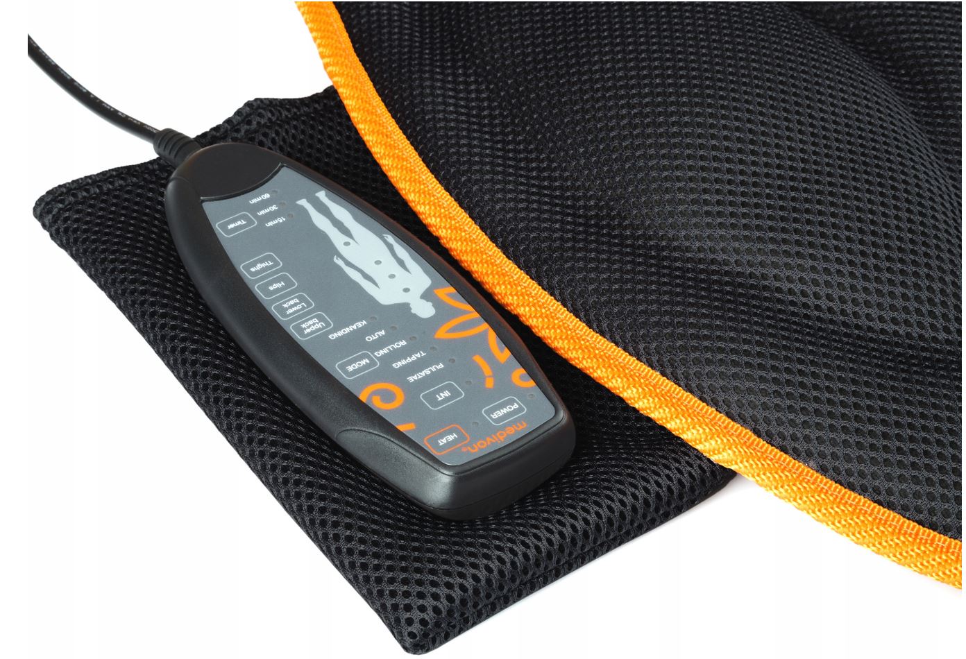 к устройству прилагается удобный пульт дистанционного управления , с помощью которого : вы включаете и выключаете коврик , устанавливаете время массажа ( 15 , 30или60 минут ) , зону массажа ( грудно-шейная , пояснично-крестцовая , вся спинаилиягодиц и бедер ) и его интенсивность ( >слабый , среднийилисильный )