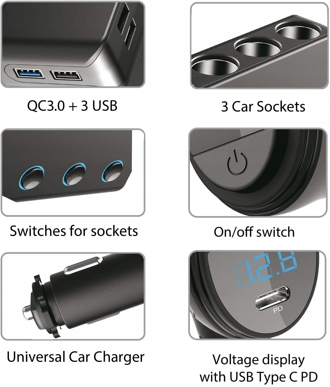 универсальная прикуриватель с 3 розетками и неизолированным переключателем для розетки 1224 в подходит для автомобилей, прицепов и многих других. Сверхвысокая производительность до 120 Вт для быстрой зарядки до 102 А 4 порта USB 1 X Quick Charge 3.0 3 x USB 68 A. Макс. 102 A Wild 4 USB-порта monowa до четырех устройств объединение идеально подходит для подключения смартфонов GPS-камер планшетов устройств Bluetooth powerbank и многих других. 1 x USB с технологией Quick Charge 3.0 QC3. 0 Wild which mona очень быстро настраивает свои устройства совместим с устройствами быстрой зарядки USB Type-C 18 Вт питание позволяет очень быстро регулировать вольтметр с вентилятором светодиодный монитор mona автомобильный аккумулятор во время вождения компактный и практичный