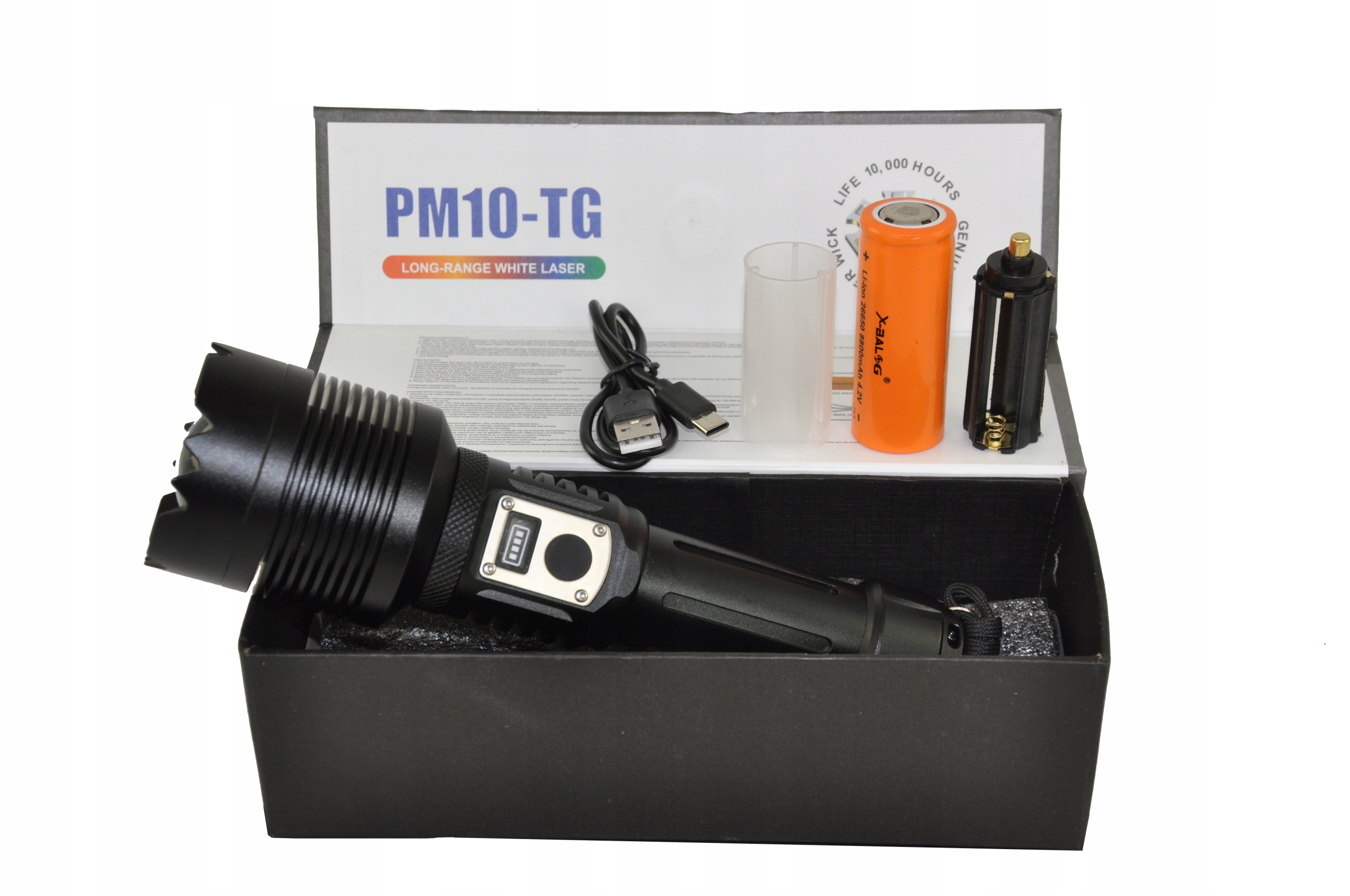 фонарик питается от включенной батареи типа 26650 8800mAh 4.2 V. дополнительно фонарик может питаться от включенной в комплект проставочной трубки батареей 18650 или батареями 3xaaa через адаптер, который также входит в комплект.