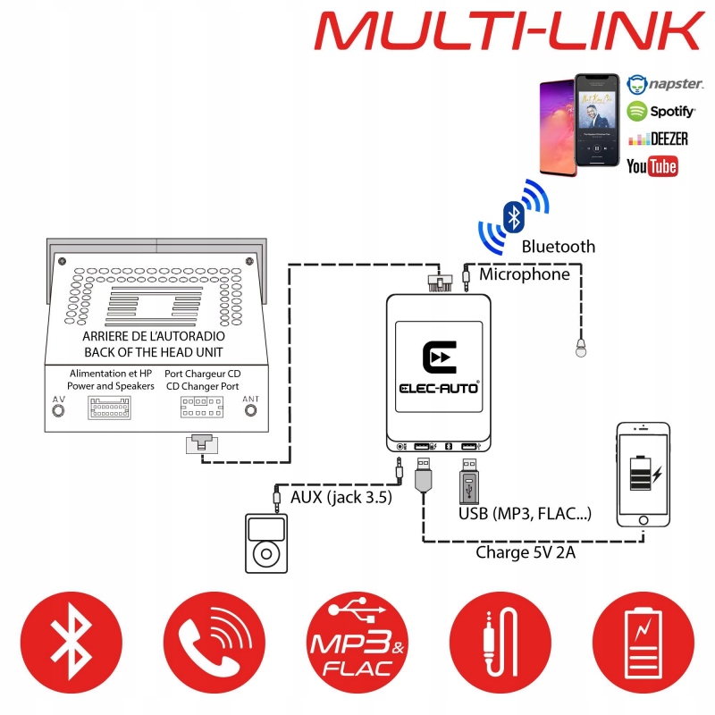 MULTI - LINK - это интерфейс Bluetooth, USB и вспомогательный интерфейс, разработанный ELEC-AUTO, который преобразит ваше оригинальное автомобильное радио Citroën и позволит вам: