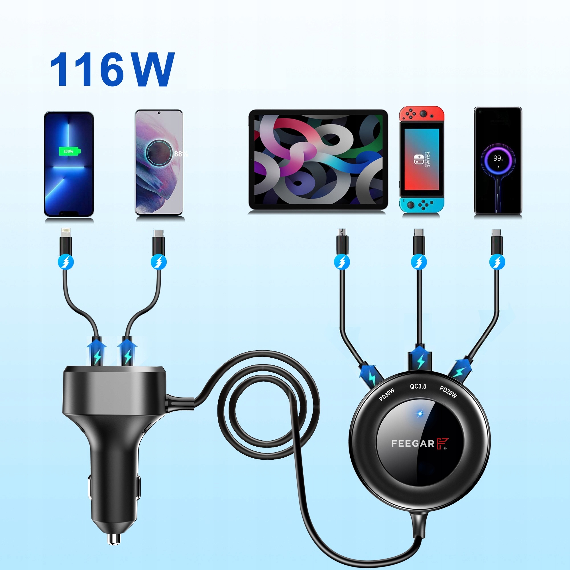 Сигарер Feegar-отличный аксессуар для вашего автомобиля. Это мощный и многофункциональный автомобильный разъем, который идеально подходит для вашего автомобиля. Это многофункциональное автомобильное зарядное устройство CigaRear с прочным гибким зажимом на задней панели. В вашем распоряжении набор из 3 дополнительных USB-адаптеров на заднем сиденье в любом месте. Отличное решение для семейного путешествия или с друзьями. Это польский бренд в сфере бытовой электроники.