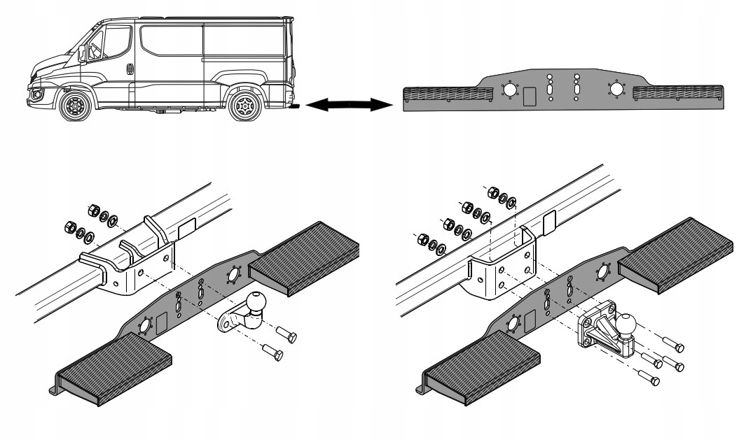 двойной порог Steinhof может быть установлен на любой автомобиль с буксировочным крюком и фланцевым шаром, установленным на 2 Средиземья с расстоянием между отверстиями 90 мм, и крюками с фланцевым шаром, установленным на 4 отверстия с расстоянием между 83 x 56 мм.