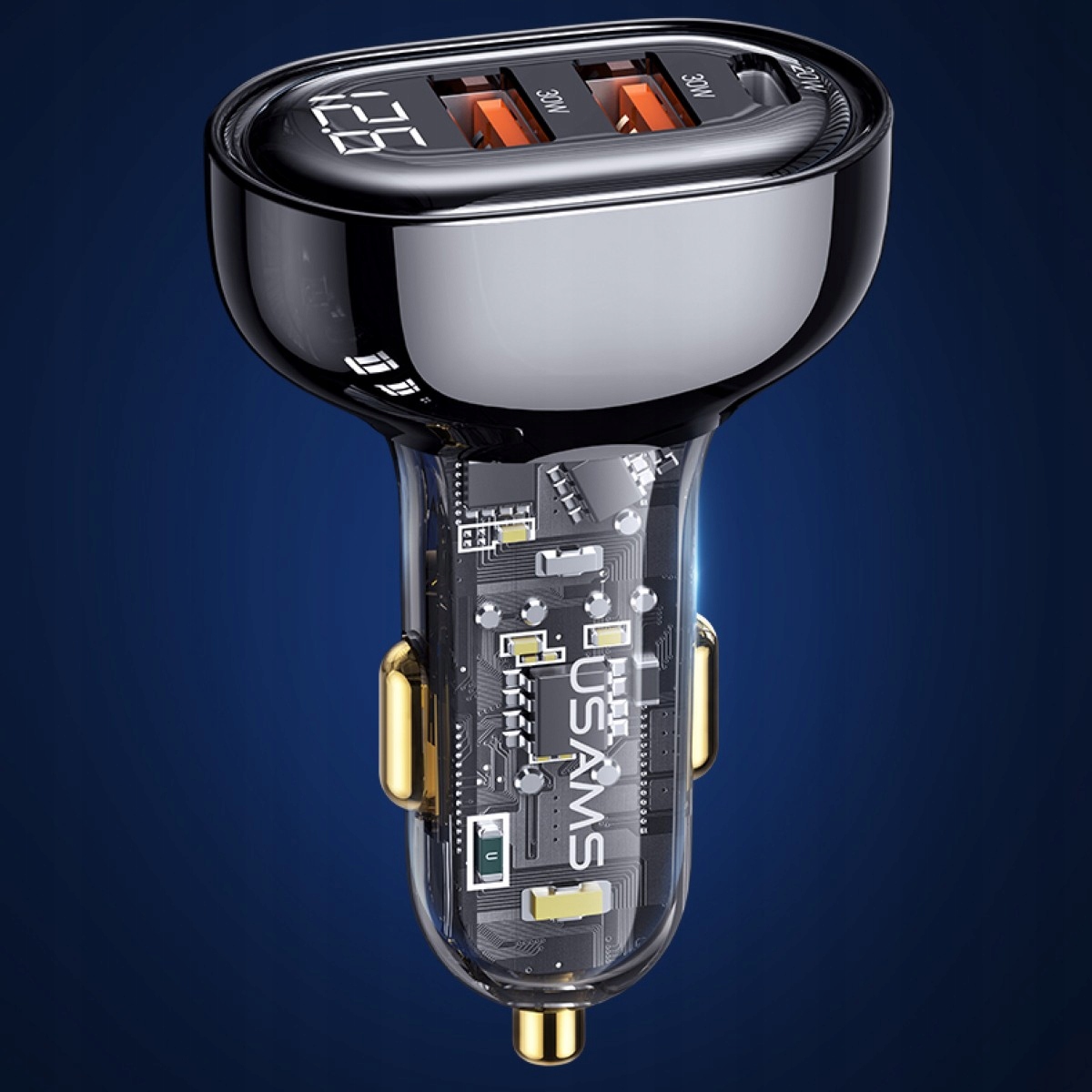 классический дизайн позволяет зарядному устройству вписаться в интерьер любого автомобиля. Три порта позволяют заряжать три устройства одновременно, а интеллектуальная система всегда будет выбирать идеальное напряжение и силу тока для заряжаемого устройства. Используемая светодиодная подсветка позволяет удобно использовать зарядное устройство в ночное время.