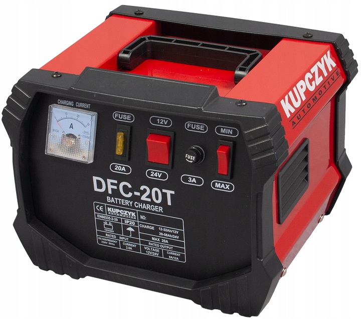выпрямитель для зарядки аккумуляторов Kupczyk DFC-20t предназначен для зарядки кислотных аккумуляторов током 12В или 24В. устройство оснащено интуитивно понятной панелью управления с практичным поворотным (аналоговым) дисплеем. На панели расположены удобные переключатели: 12 В / 24 В и кнопки медленной и быстрой зарядки. Кроме того, выпрямитель имеет предохранитель для защиты от перегрузки. Дополнительным преимуществом является компактная конструкция устройства и практичная ручка для переноски.п>