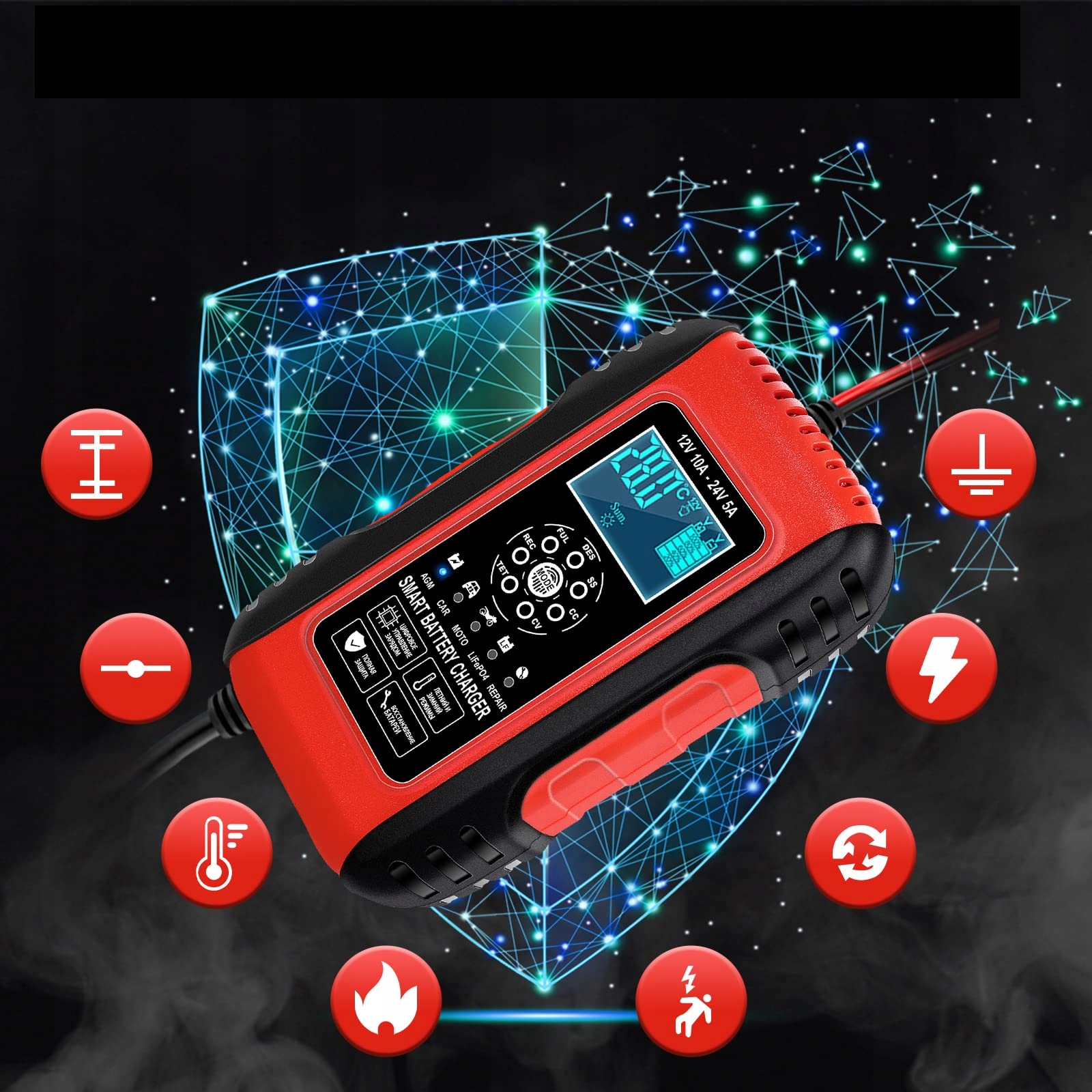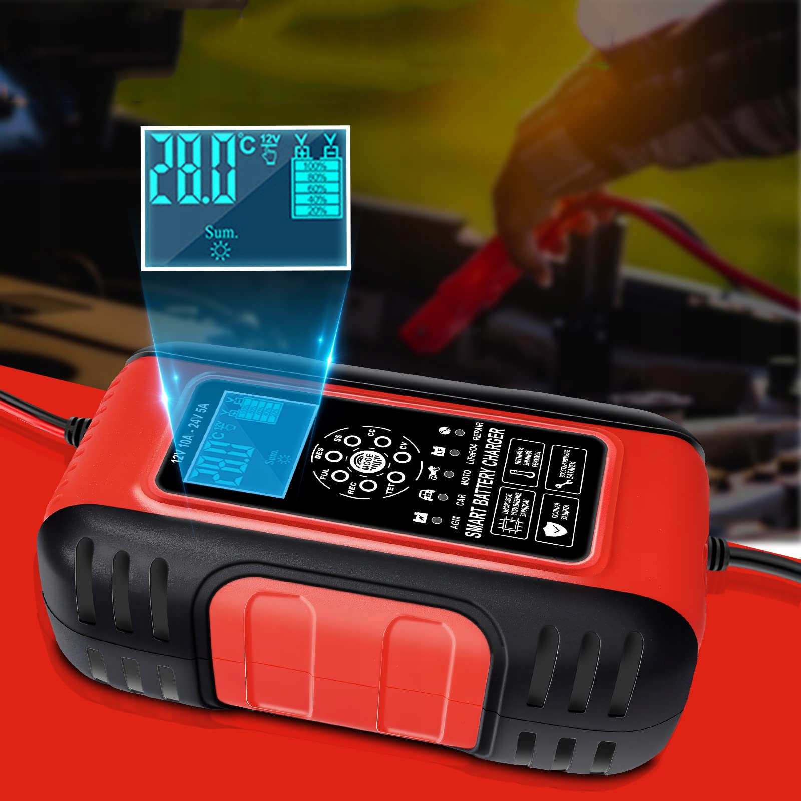 автомобильное зарядное устройство с функцией температурной компенсации. Это позволяет эффективно заряжать аккумулятор в холодные и жаркие дни без перезарядки аккумулятора.