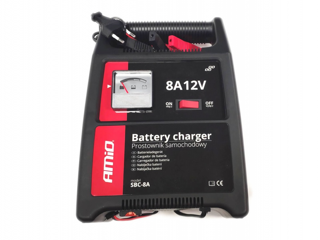 выпрямитель AMiO с наконечником, 8A, 12V - SBC-8A. имеет пластиковую крышку ABS, позволяет быстро заряжать свинцово-кислотные аккумуляторы, имеет индикацию состояния заряда, защиту от перезаряда. Параметры работы: выходное напряжение: 12 В, ток зарядки: 8A.