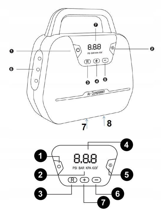 подключите компрессор к источнику питания, установите кнопками " + " и " - " заданное значение давления, кнопкой M вы можете изменить блок (PSI / BAR / KPA / KG/CM3) - включите работу компрессора кнопкой справа.п>