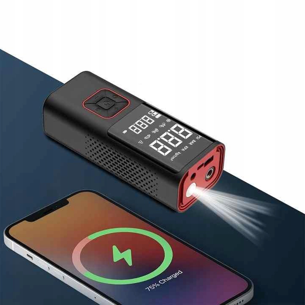 Компактный насос — идеальное решение для использования дома или в мастерской, но его также можно использовать во время путешествий. Это современный универсальный компрессор, позволяющий легко надувать мячи, колеса велосипеда, колеса автомобиля и различные виды матрасов. Благодаря большой батарее емкостью 6000 мАч и функции powerbank вы также можете заряжать свой телефон, планшет или умные часы.