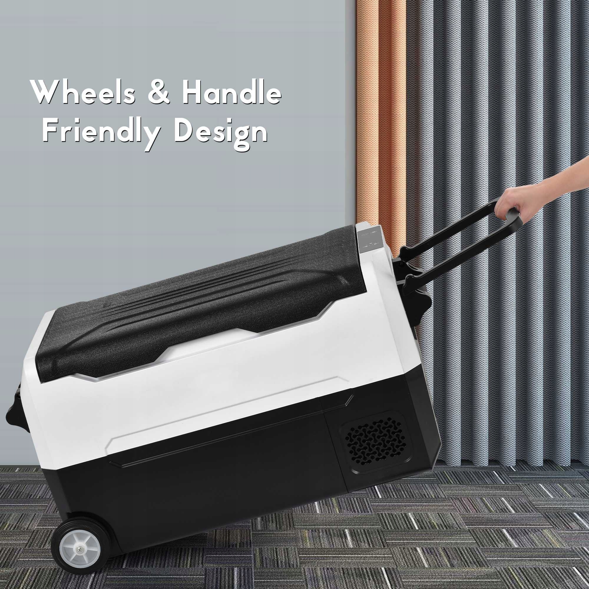 Автомобильный холодильник оснащен колесиками и ручкой для плавного перемещения.