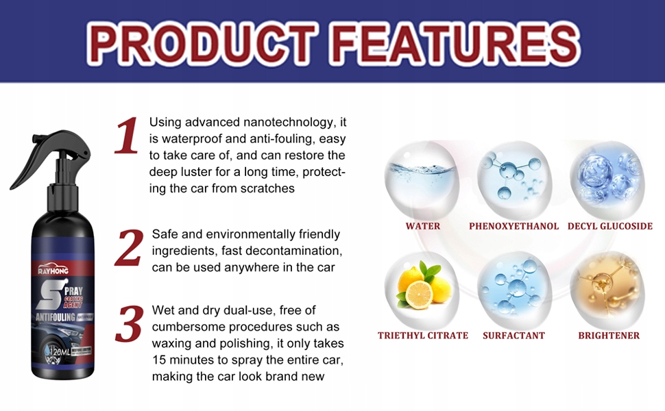 【无水清洗】只需用喷涂剂喷洒汽车油漆,接触后立即消除污垢、污垢、鸟粪、虫子、泥土、灰尘、油脂和顽固污渍,节省时间和金钱。不再有繁琐的洗车。