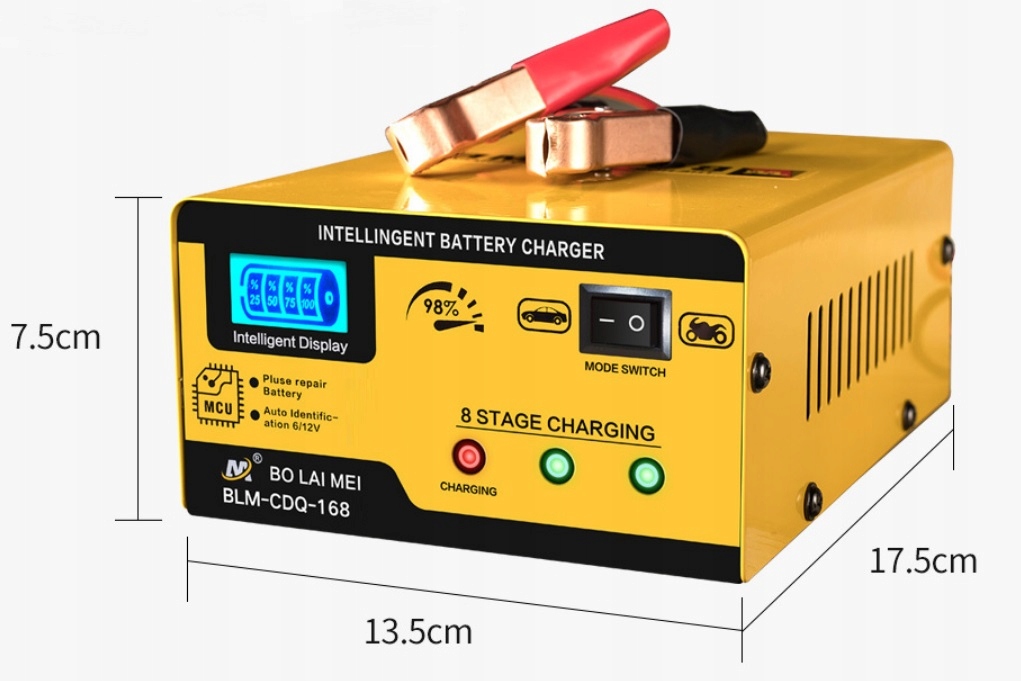 подходит как для аккумуляторов 12 В, так и для 24 В, работает с SLA, WET, MF, FLOODED, GEL, VRLA, AGM, EFB, что означает, что его можно использовать для аккумуляторов в автомобилях, мотоциклах, лодках, косилках, сельскохозяйственных транспортных средствах и многом другом.
