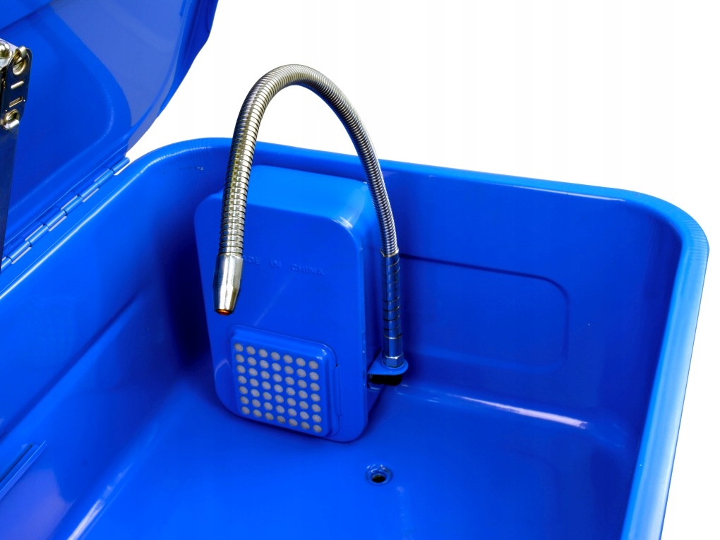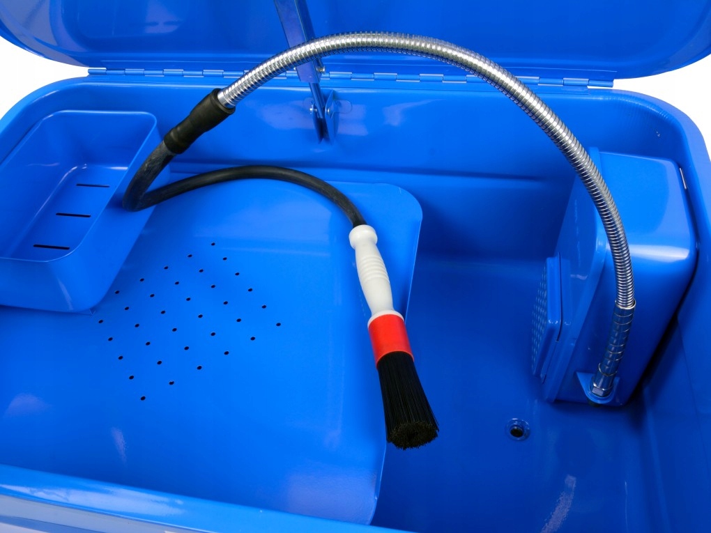 мойка оснащена насосом, к которому подключен гибкий стальной шланг,который не деформируется после его установки. Направляем выход шланга на участок очищаемого предмета, закрываем крышку и ждем результата.п>