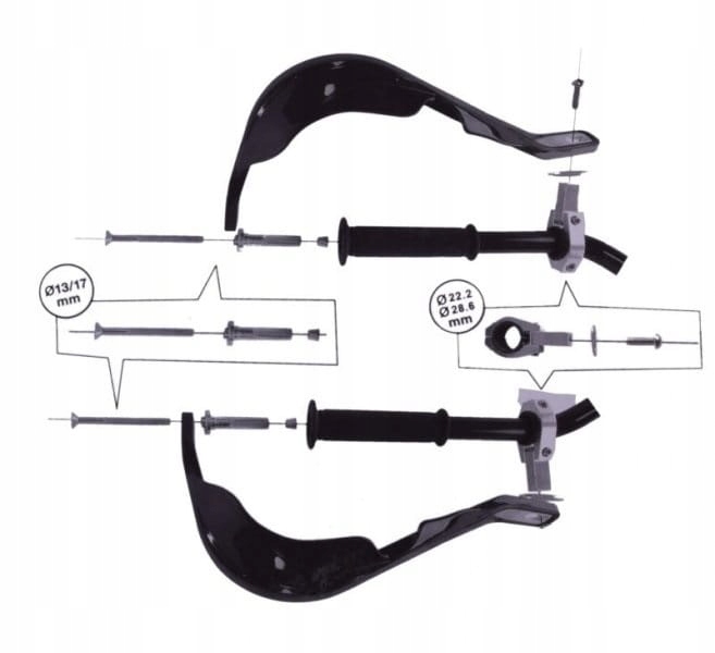 - набор имеет 2 защитных кожуха и набор креплений на руль диаметром 22 мм