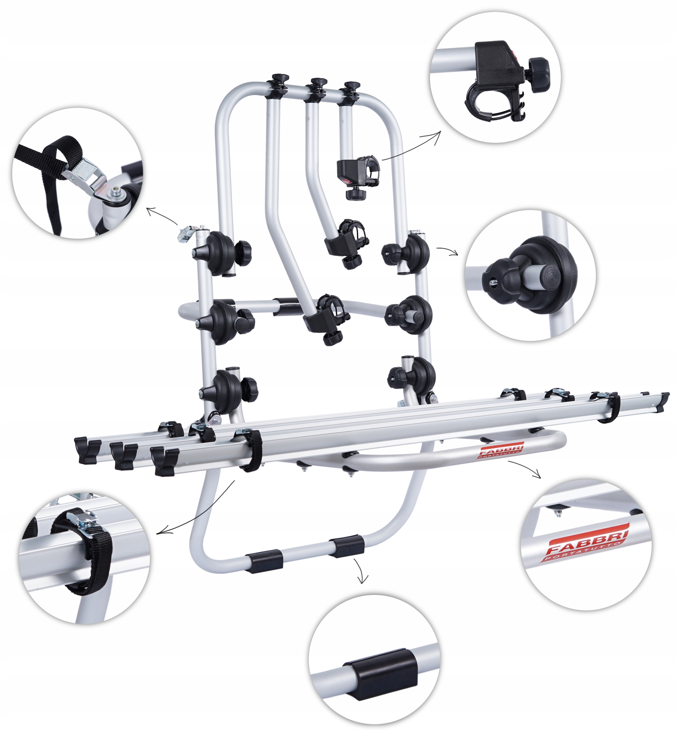 складная, алюминиевая, итальянская ручка для перевозки 3 велосипедов, устанавливается на заднюю дверь багажника автомобиля с помощью 6 ремней. Используемые решения позволяют безопасно перевозить велосипеды о: