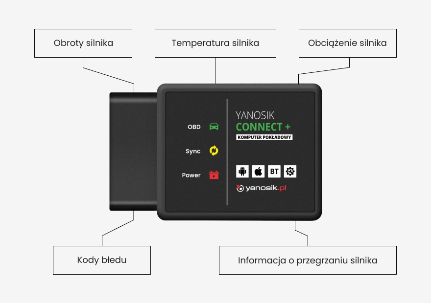 Yanosik Connect+ работает с приложением Yanosik, установленным на мобильном телефоне с операционной системой Android или iOS и Bluetooth версии не ниже 3.0. Устройство передает в приложение информацию об ошибках двигателя вашего автомобиля.