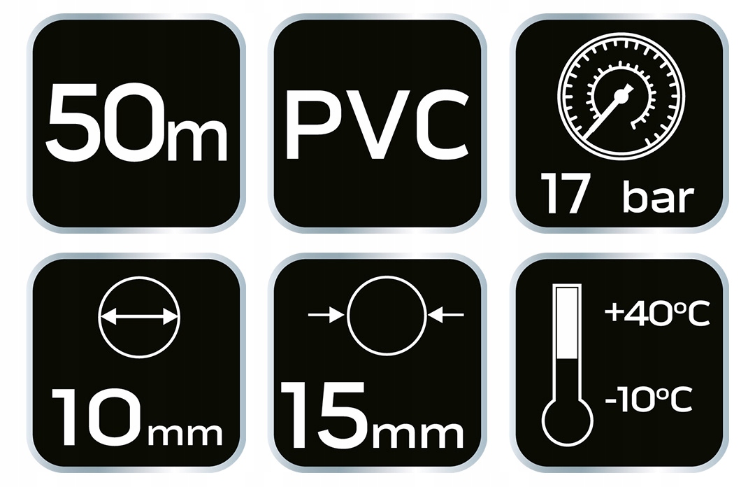 Армированный напорный шланг NEO (арт. 12-080) из высококачественного ПВХ, внешний диаметр 15 мм, внутренний диаметр 10 мм, длина 50 м. Максимальное рабочее давление 17 бар. Кабель может использоваться в диапазоне температур от - 10 до + 40°С. Бренд NEO оправдывает ожидания профессионалов.