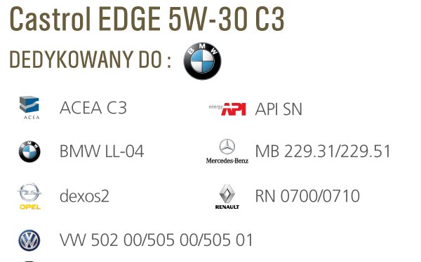 Castrol EDGE 5W-30 C3 рекомендуется для новейших конструкций двигателей ведущих OEM-производителей. Всегда проверяйте