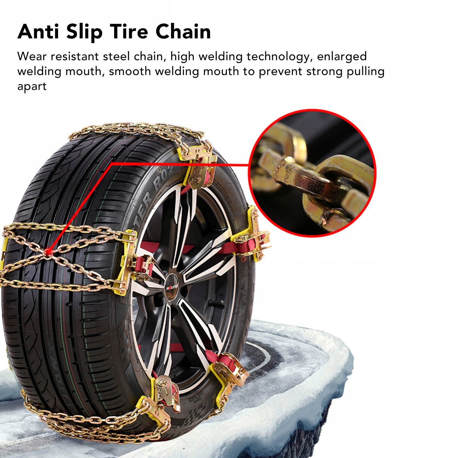 1. Прочное сцепление: противоскользящие цепи прочно прикреплены к шинам, обеспечивая превосходное сцепление и тягу. Не беспокойтесь о выходе на улицу в снежный день.