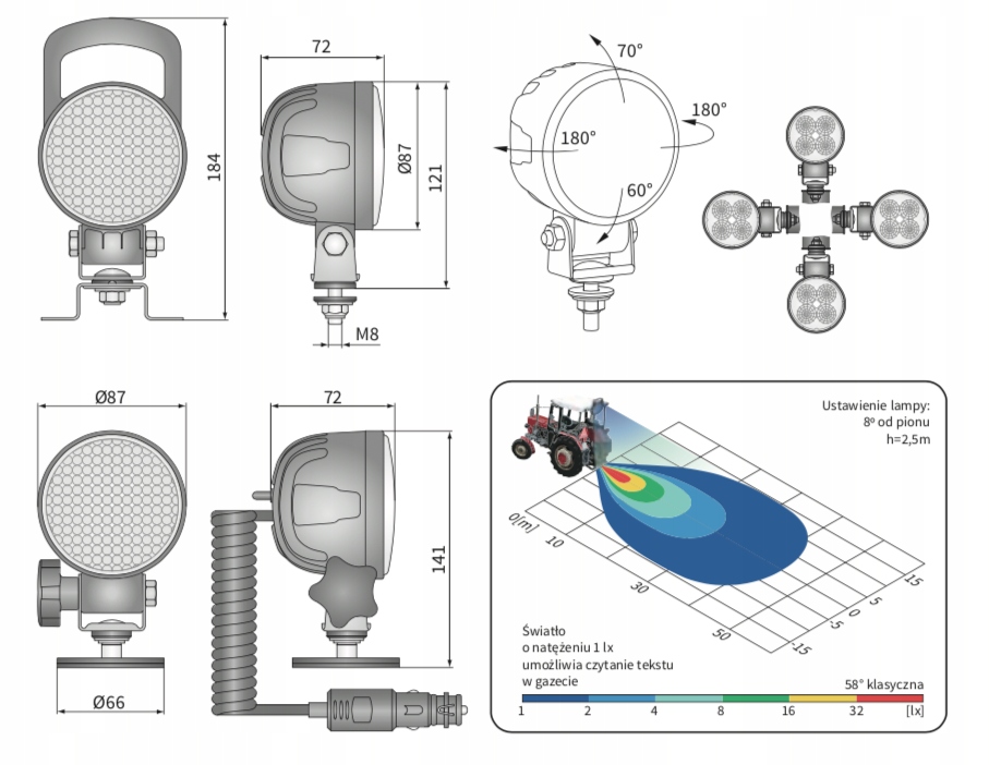 используются для освещения мест вокруг транспортных средств, тракторов, медленных машин и любых мест, обеспечивающих возможность питания указанным напряжением.Они соответствуют директиве по электромагнитной совместимости 2004/108/EC. Они не излучают электромагнитных помех и устойчивы к ним. Они требуют питания с правильной полярностью. Места установки: как отдельно стоящие на элементах кузова. Они могут быть установлены в любом положении (стоячий, подвесной,боковой).