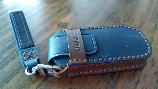 в ассортименте высококачественный кожаный чехол ручной работы CRAZY HORSE темно - синего цвета с коричневыми аксессуарами и застежкой - вкладкой с ремешком для ключа SMART 4+3 кнопки для моделей KIA от 2021 года (бесконтактный запуск автомобиля):
