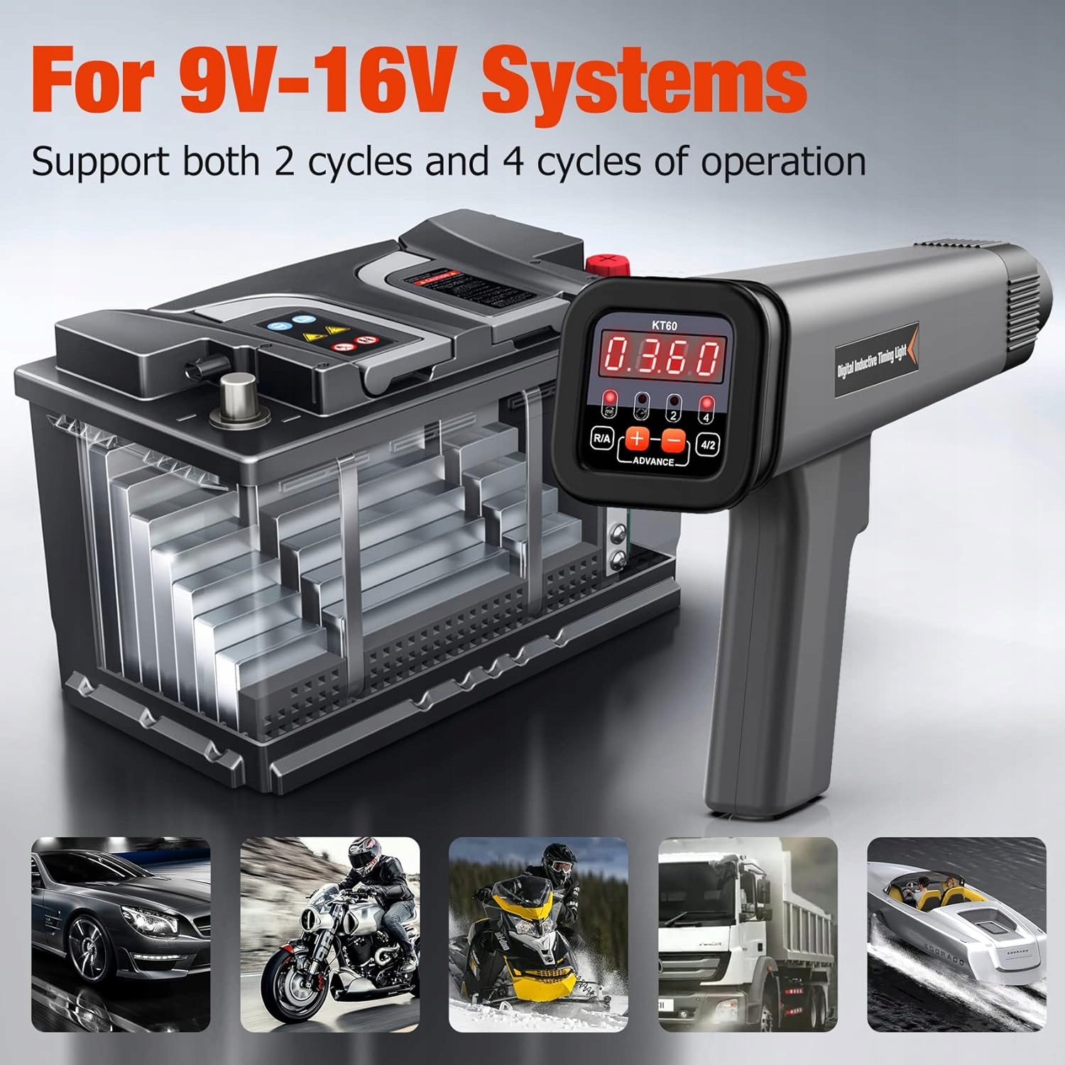 Работает как с 2-тактными, так и с 4-тактными двигателями. Простая в использовании кнопка экономит много работы при настройке различных типов двигателей. Работает в автомобилях с напряжением 6 и 12 В (для работы с напряжением 6 В требуется отдельный автомобильный аккумулятор 12 В).