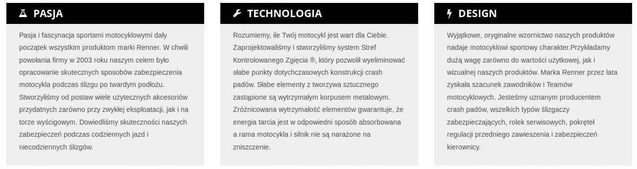 набор краш-колодок имеет двухзонную конструкцию-внешняя зона поглощает энергию удара и изгибается в строго определенной точке. Внутренняя часть-это правильное крепление к оригинальным компонентам мотоцикла-раме или блоку двигателя. Прочность болтов и их резьбы подобрана таким образом, чтобы не вызвать обрыв резьбы или изгиб рамы мотоцикла при ударе. Болты во внутренней зоне имеют гораздо более высокий класс прочности (12,9), чем болты во внешней части (8,8). Таким образом, Реннер устранил основной недостаток других crash Pad, доступных на рынке.