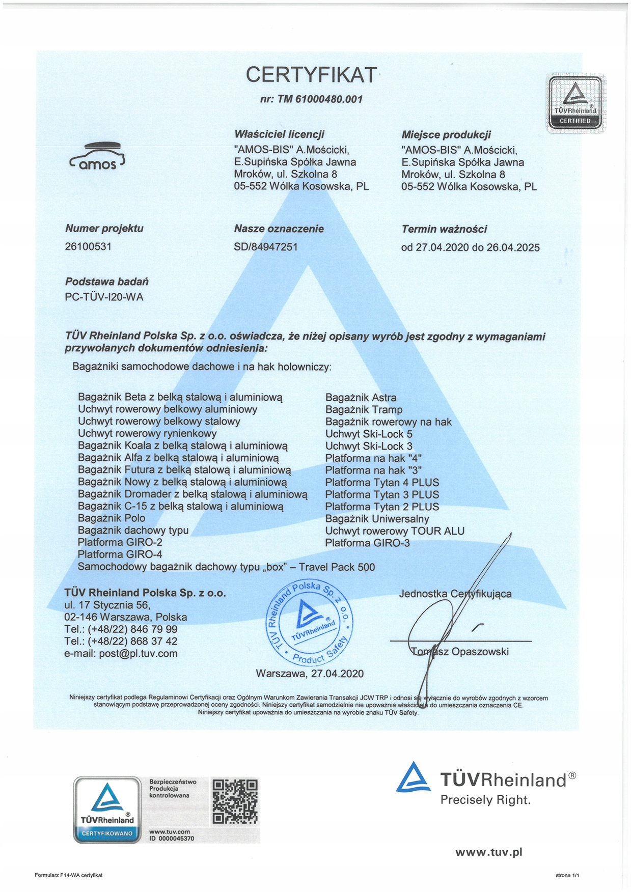 наличие у Amos сертификата TÜV является гарантией безопасности использования продукции данного бренда. Выбирая платформу Amos, вы уверены, что вы и ваши велосипеды безопасны на протяжении всей поездки.