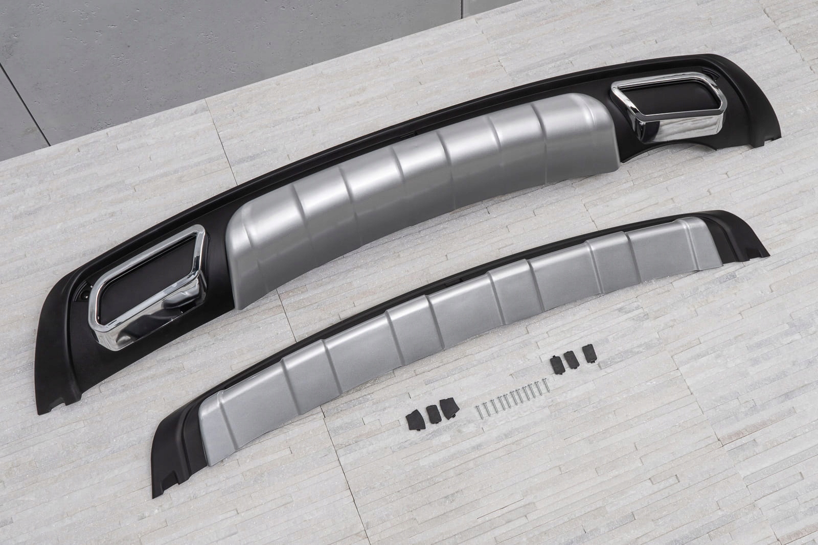 в комплект входят две дополнительные функции: для передней и задней части автомобиля. Крышки изготовлены из высококачественного АБС-пластика, покрытого лаком черного цвета и серебристого алюминия. Дополнительные имитации выхлопных наконечников были встроены в заднюю юбку, что придает сильный характер. Хромированные имитационные окантовки добавляют декоративности элементу. В комплект поставки входят монтажные элементы. Мы рекомендуем установку в профессиональной мастерской.п>