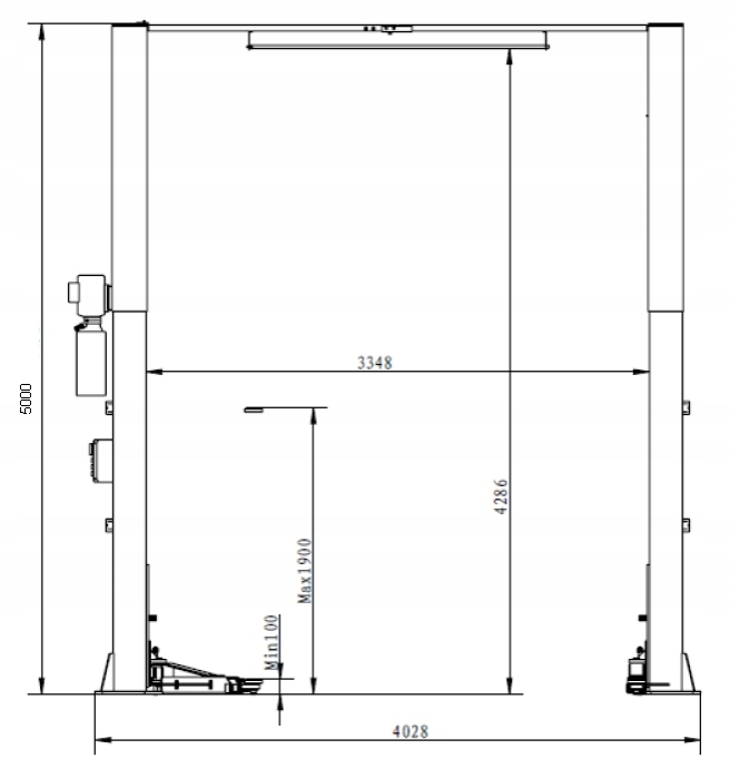 грузоподъемность:5500 кг время подъема:50 с время опускания: 40 с высота подъема: 1900 мм мин. выс. опорных точек:100 мм высота колонн:5000 мм расстояние между колоннами:3348 мм общая ширина:4028 мм Мощность двигателя:3 кВт источник питания:400V 3 фазы защита:16A ------------------------------------------------------------------------------------------------------------------------------------------------------------------------------------------------------------------