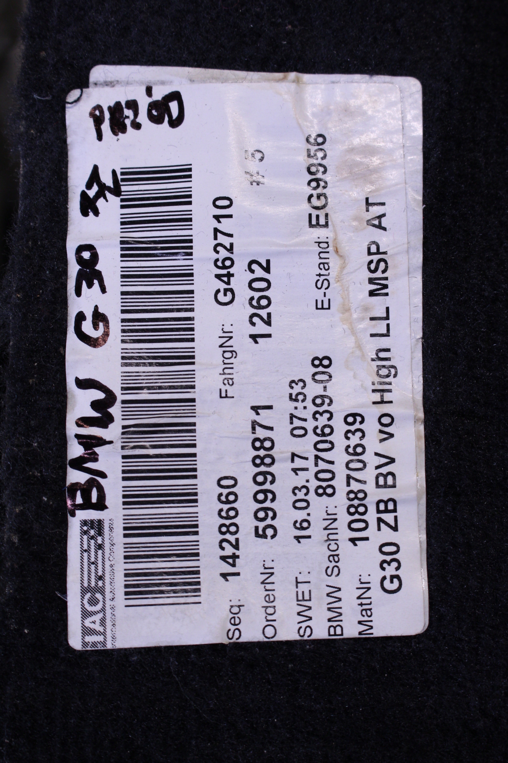 Ковровое покрытие переднее BMW 5 G30 17R.