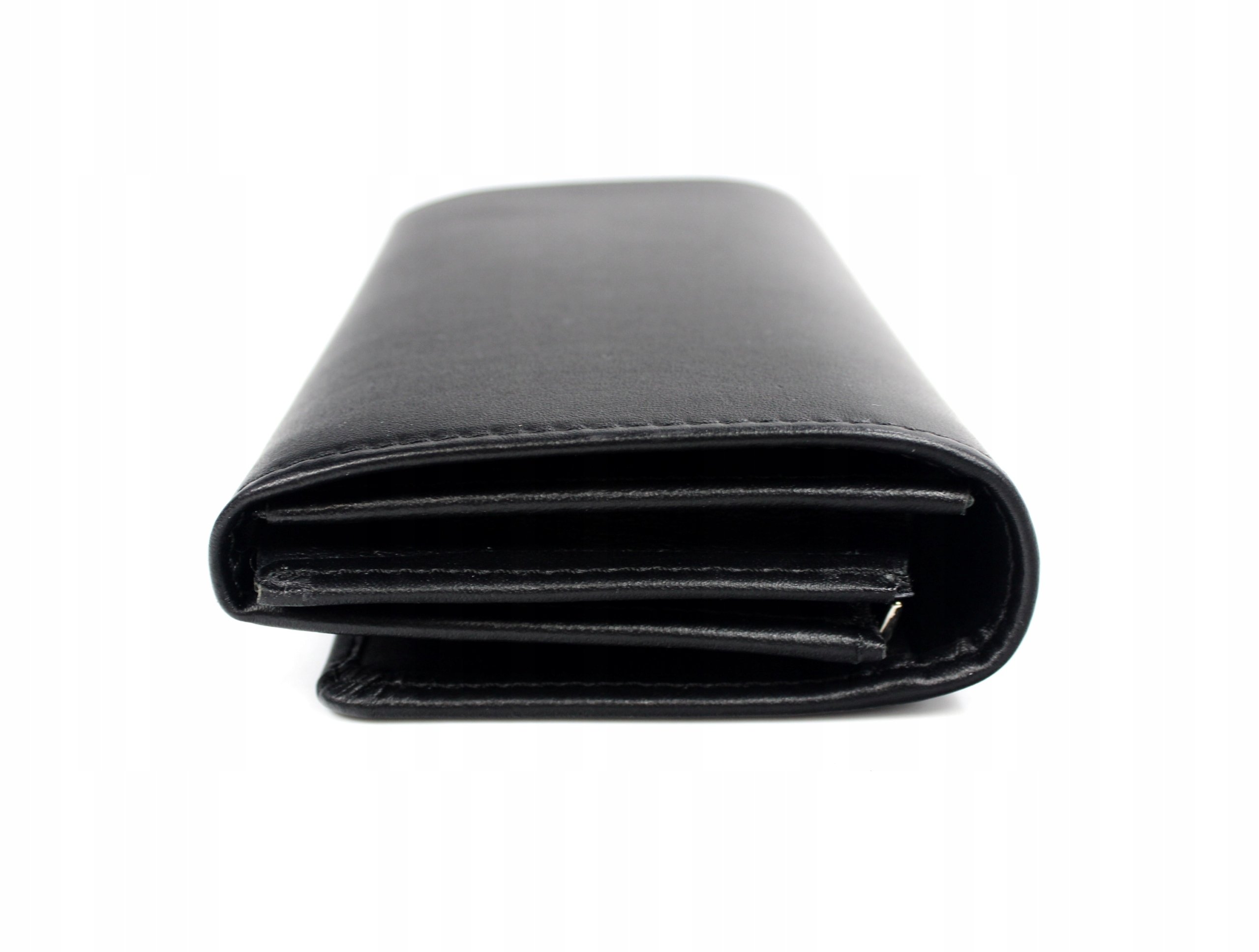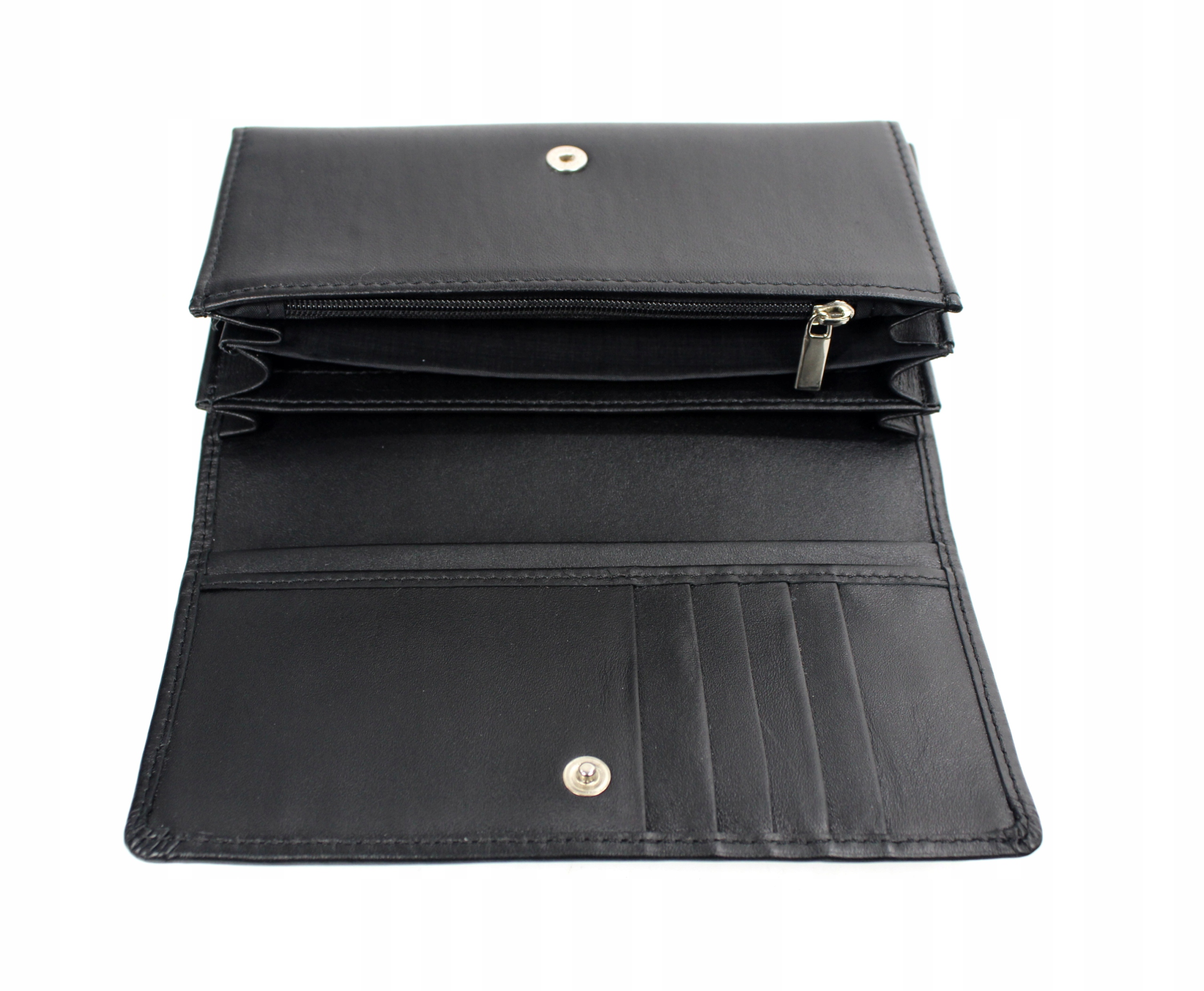 Застегивается на кнопку, внутри имеет 3 отделения, одно на молнии, 3 других кармана и 5 мест для платежных карт или документов.